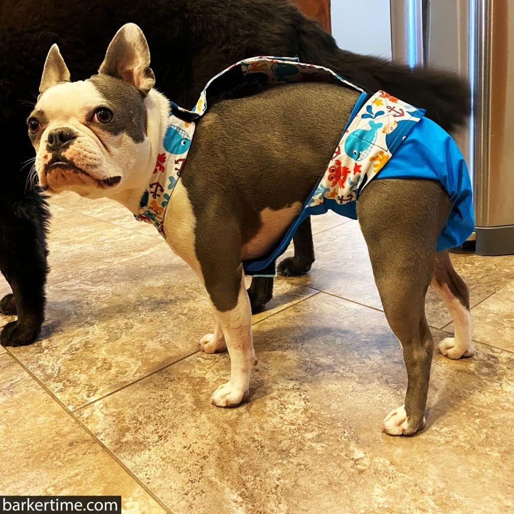 Handcrafted to perfection so your furbaby can stay clean and comfortable while you have complete peace of mind. The Barkertime Escape-Proof Dog Diaper Overall is suitable for both male and female dogs with incontinence issues, behavioral marking, excitable urination or females in heat. Specifically designed for the ''Houdini'' escape-artist dogs that have difficulty keeping diapers on. The best Full-Body Suit solution for your furbaby available in hundreds of prints and designs. Designed and handmade by Barkertime in Huntington Beach, California USASize ChartPlease go up one size if your dog is between sizes Size XS: Waist 9 - 2 inches, Neck 5 - 8 inches, Neck to Waist 5 - 7 inches, Neck to Tail 10 - 12 inches Size S: Waist 12 - 15 inches, Neck 8 - 11 inches, Neck to Waist 7 - 10 inches, Neck to Tail 10 - 13 inches Size M: Waist 15 - 18 inches, Neck 12 - 15 inches, Neck to Waist 10 - 13 inches, Neck to Tail 13 - 17 inches Size L: Waist 18 - 22 inches, Neck 16 - 19 inches, Neck to Waist 12 - 17 inches, Neck to Tail 13 - 22 inches Size XL: Waist 22 - 30 inches, Neck 20 - 23 inches, Neck to Waist 14 - 20 inches, Neck to Tail 20 - 26 inches Size XXL: Waist 30 - 43 inches, Neck 23 - 26 inches, Neck to Waist 17 - 25 inches, Neck to Tail 27 - 36 inches Check out Barkertime on Amazon for more options for pet diapers, incontinence products, pet fashion items and other accessories made in USA.