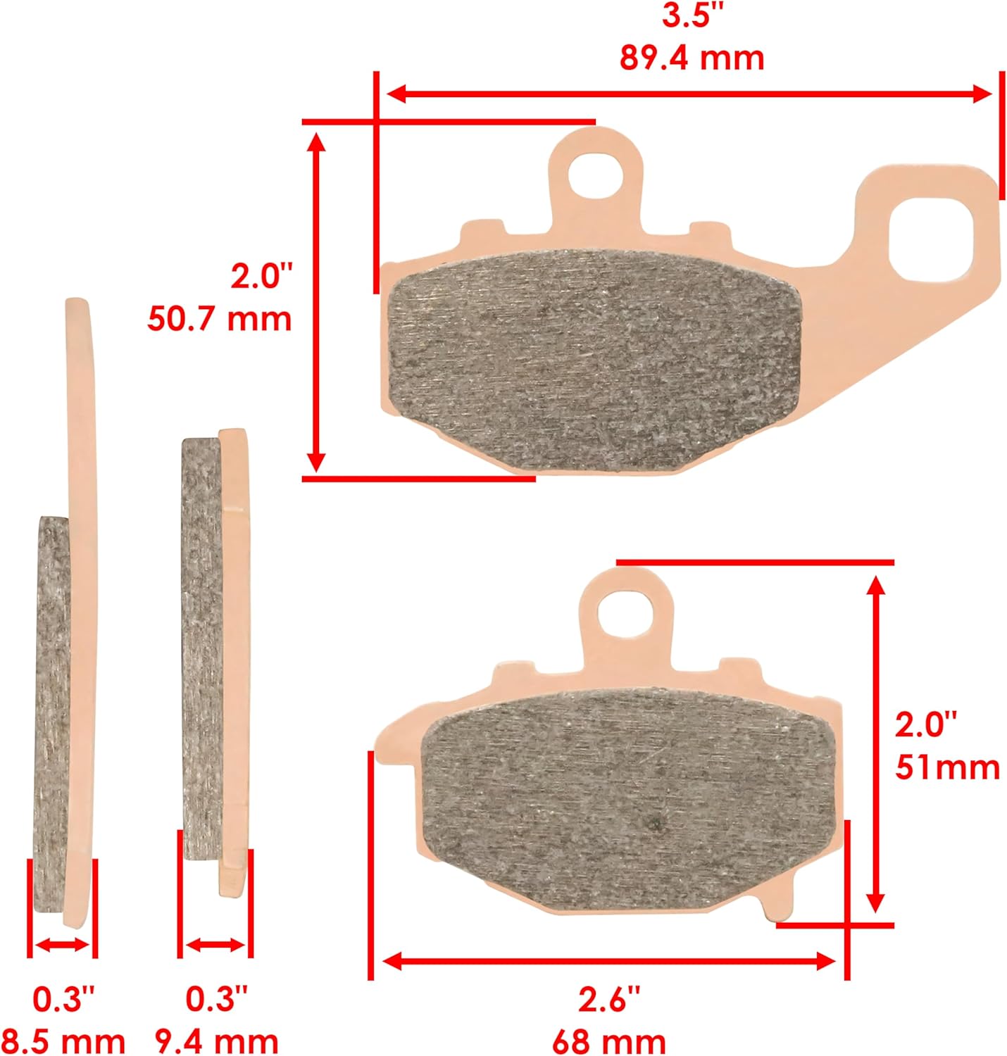 • Dimensions: Front Brake Pad: Item Length: 133.5 mm - 5.3 in, Item Width: 37.5 mm - 1.5 in, Item Height: 8.3 mm - 0.3 in, Front Brake Pad: Item Length: 133.5 mm - 5.3 in, Item Width: 37.5 mm - 1.5 in,Item Height: 8.4 mm - 0.3 in, Rear Brake Pad: Item Length: 89.6 mm - 3.5 in Item Width: 51 mm - 2 in Item Height: 8.9 mm - 0.4 in