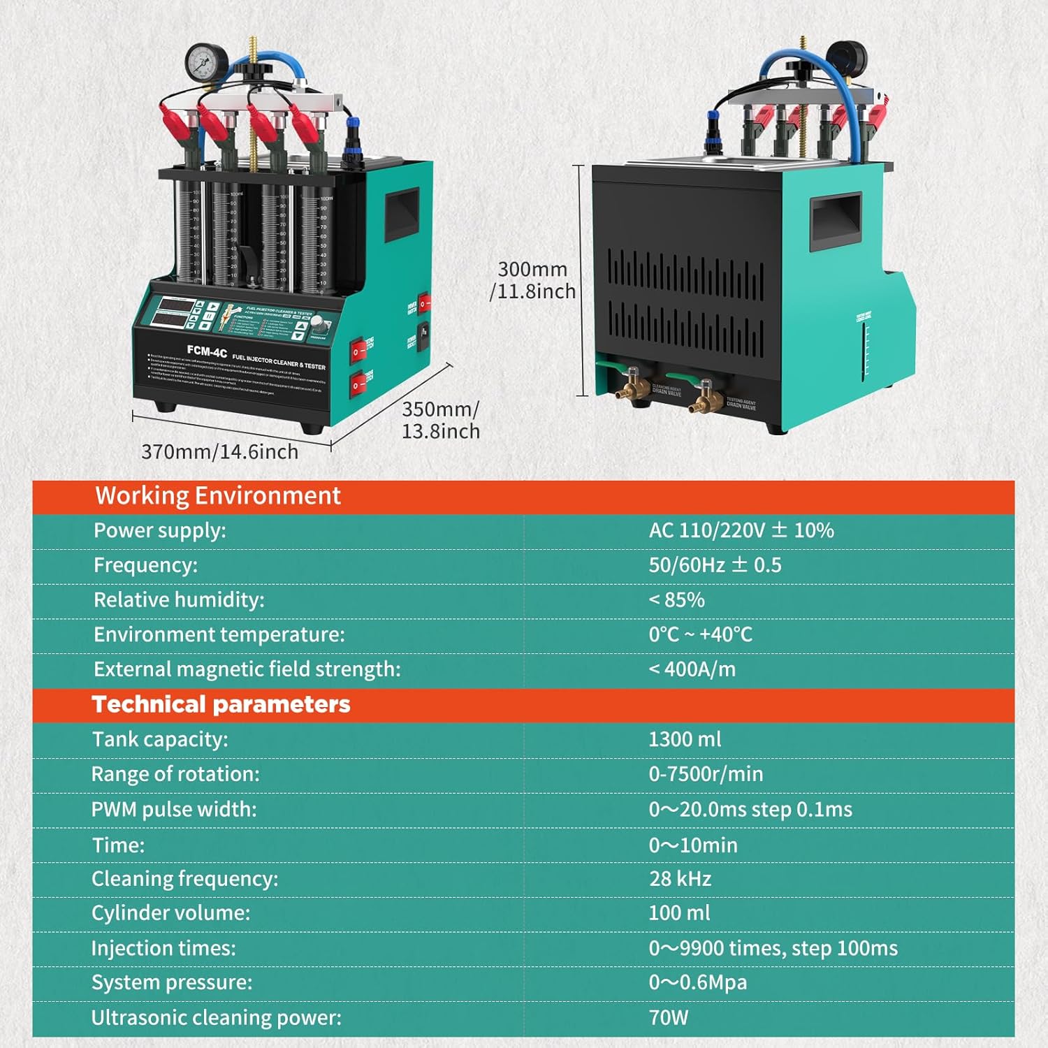 • 【FCM-4C Fuel Injector Cleaner Machine】 This is a multi-functional device that provides integrated cleaning and testing services for fuel injectors in Electronic Fuel Injection (EFI) and Sequential Fuel Injection (SFI) systems. The machine can simulate actual engine operating conditions to clean and test fuel injectors. Its operation panel is concise and clear, making the operation simple and easy.