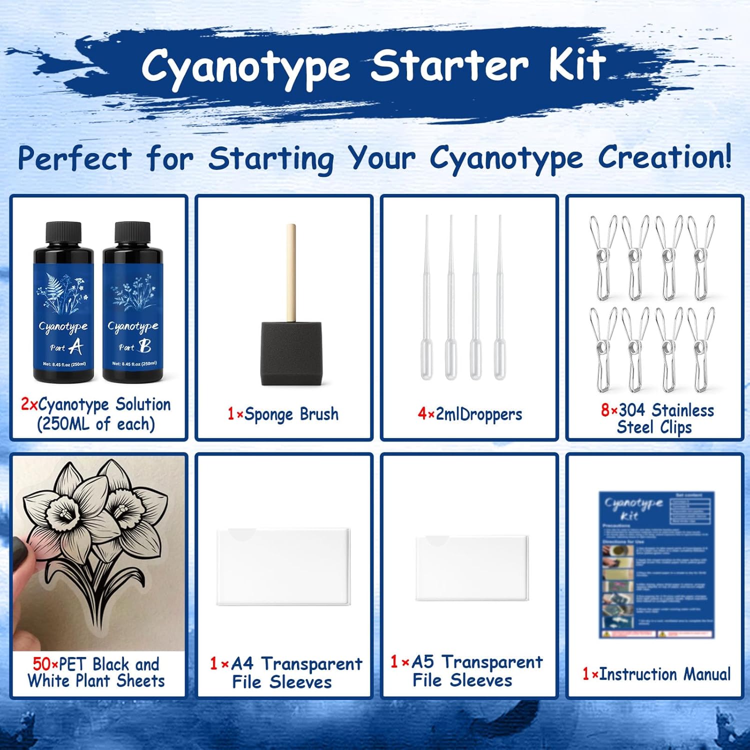 | Included Components | Cyanotype Kit A & B, Disposable 2ml pipettes, Cyanotype plastic sleeves, Metal binder clips |